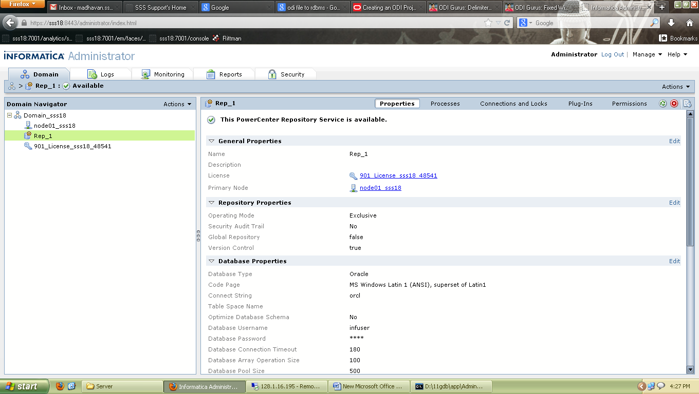 Enable the service ,After the repository creation below screen will be seen. The repository service will be running in “Exclusive” mode as shown below. This needs to be change to “Normal” before we can configure Integration service.